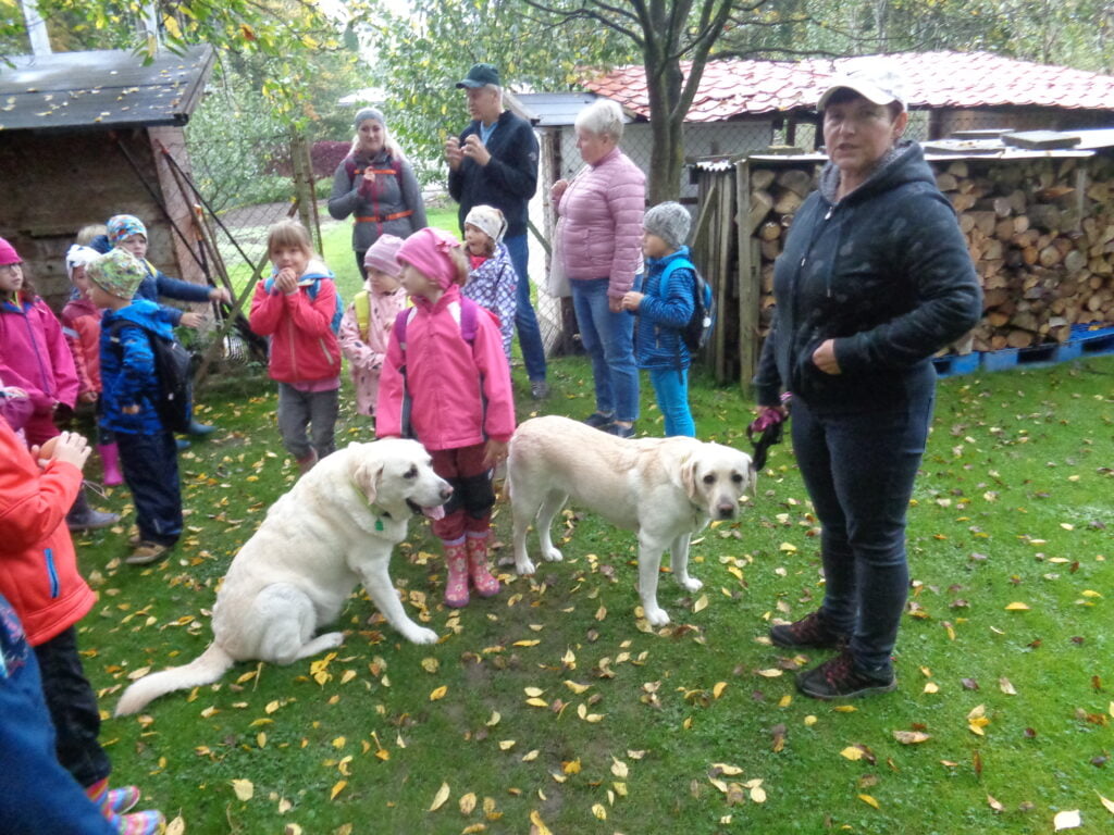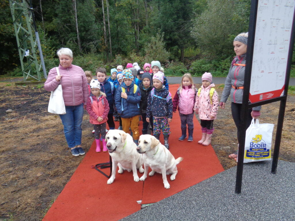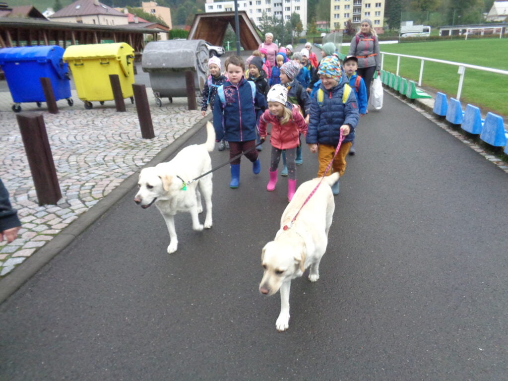 Uběhl už celý rok od doby, kdy jsme naposledy navštívili naše zvířecí přátele z Karolinky – pejsky Benžiho a Elsu se zkouškami z canisterapie, asistence a záchranáře. Za uplynulý rok se toho u nás hodně událo, vrátili jsme se ze skleníku do opravené školky, máme novou třídu, nové děti, paní učitelky i paní uklízečky. Zažili jsme i uzavření mateřské školy, testování, někteří z nás prodělali nákazu koronavirem… Jistotou jsou proto pro nás naši psí kamarádi se svojí obětavou instruktorkou, paní Pavlínou Dujkovou, které jsme po roce opět rádi viděli. Ve čtvrtek 30.září se naši předškoláci vypravili na výlet do Karolinky, přímo do zahrady manželů Dujkových. Benži je už vážený psí pán a Elsička je o rok rozumnější. Paní Dujková je stále plná elánu, proto vymyslela dětem spoustu zábavných her a soutěží. Na zahradě se děti mohly pomazlit s morčátky, pohladit králíčky, pohrát si s připravenými hračkami a nechyběla ani dětská čtyřkolka. Největší úspěch však měli oba pejskové, kteří po celou dobu s dětmi dováděli a jako správní asistenční psi při soutěžích asistovali. Výlet se jako vždycky vydařil, za což patří manželům Dujkovým velký dík.